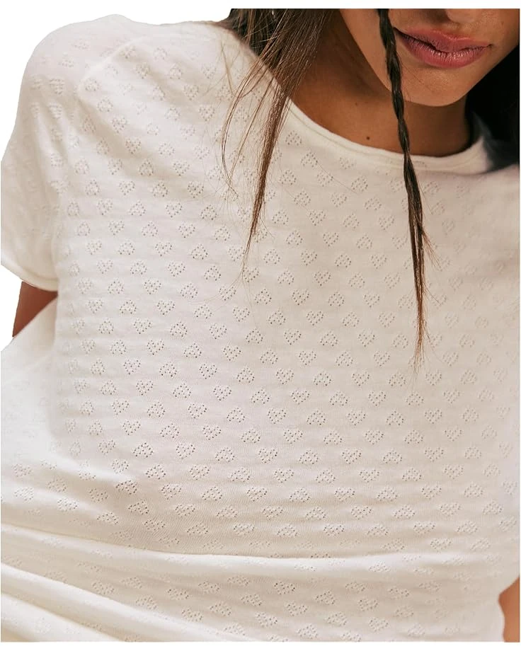 - Wear your heart on your sleeve-literally and stylishly! The Free People™ Be My Baby SS Pointelle Heart top combines a slim, relaxed fit with delicate pointelle fabrication for a romantic yet breezy vibe. Its scoop neckline and raglan-cut sleeves flatter your frame, while exposed seams and lettuce-edge trim add a touch of vintage charm. Perfect for layering or wearing solo, this chic design ensures effortless style for any occasion.