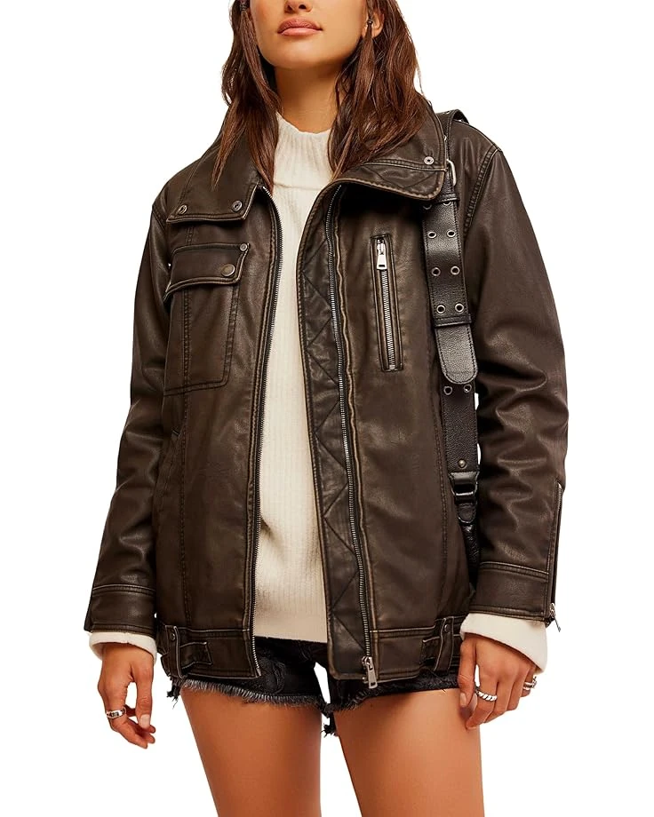 - Buckle up for style and sustainability wearing the Free People™ Vegan Leather Jacket! This timeless essential elevates any wardrobe, combining a classic silhouette with eco-friendly materials. Featuring a regular fit, long sleeves, and a zippered front closure, this jacket brings both form and function. Stay organized with hand pockets, a chest patch pocket, and a sleek zippered chest pocket. Whether you’re layering for warmth or adding edge to your look, this jacket has you covered. Crafted to be a versatile staple, it’s perfect for casual outings or dressing up with flair-your go-to piece for effortless style!