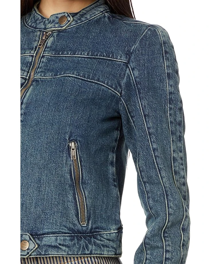 - Keep it chic and stylish with the Free People™ Fast Lane Denim Moto. This classic fit jacket features zippered front closure, long sleeves, high neckline, two side hand zippered pockets, and defined seaming throughout.