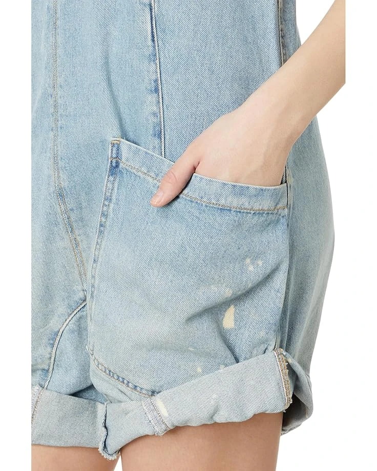 - Make a bold style statement with the Free People™ High Roller Shortall. Crafted from premium denim, its relaxed, slouchy fit exudes effortless chic. Featuring a low scoop neckline, oversized pockets, and adjustable straps, this timeless piece offers comfort and style. Elevate your wardrobe with its harem-style legs and classic railroad print.
