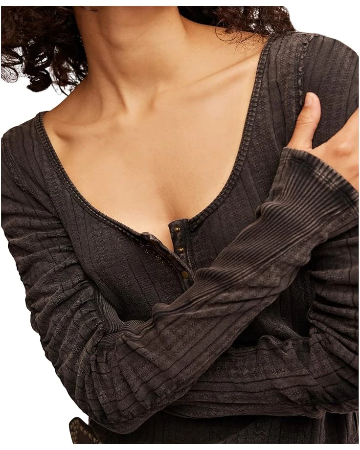 - An essential layering piece or a stand-alone favorite, this versatile Free People™ Hope Henley top is crafted from breathable fabric that moves with you. This top features scoop neckline with button front placket, long sleeves, curved hem, and exposed seam detail.