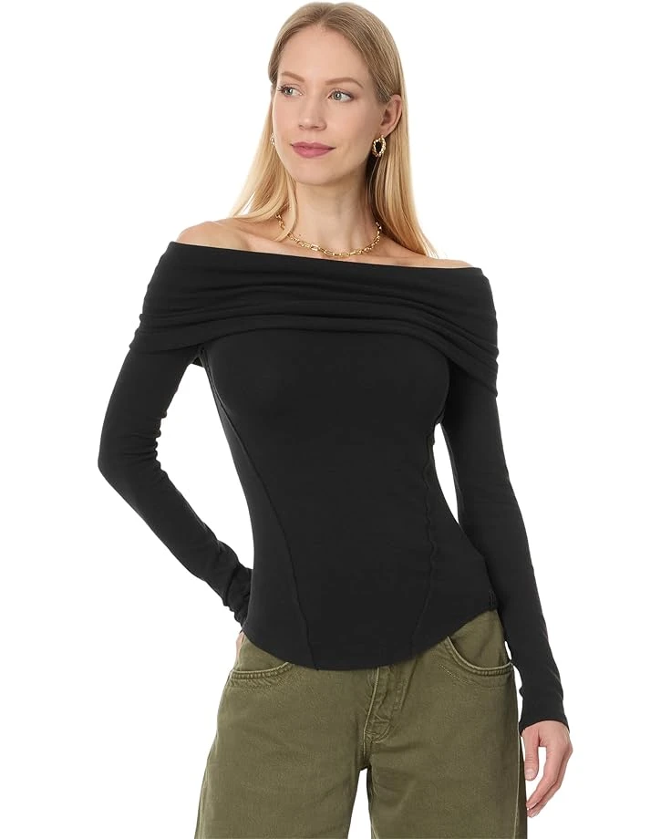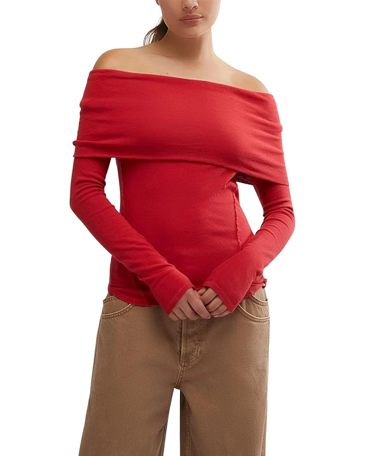 - Update your wardrobe choosing the effortlessly cool Free People™ Iris Layering top. This top boasts a soft cotton fabrication that feels as good as it looks. The off-the-shoulder style with folded neckline detail fitted long sleeves, and exposed seam detailing creates a flattering silhouette that is perfect for layering or wearing on its own.